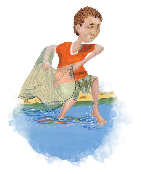 Sunscreen and life jackets on, they zoom off into the creek, passing other boats and people fishing along the way. It’s a good tide to be on the water and they even come across Cousin Dan throwing his net as far as he can. Crab pots set, they all wait patiently and play games as they guess what fish could be swimming under their boat. When it’s finally time to check the crab pots, the adventure begins as they pull up a big, angry crab! Dad teaches the children how to handle the crabs very carefully so they don’t get nipped!