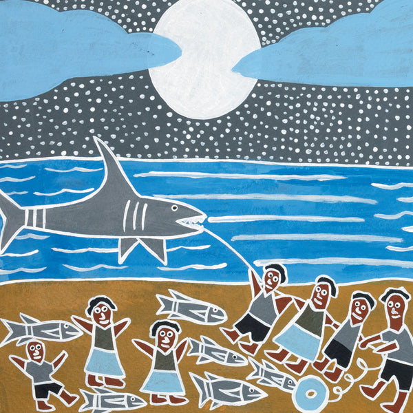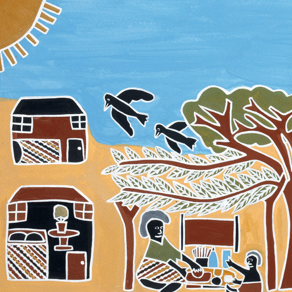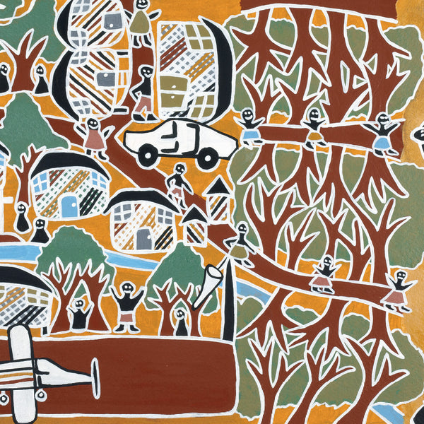 “...illustrations in acrylics mix European modernist approaches with the local indigenous style learned from her grandmother’s bark painting. Each image of her community is joyous and expressive.”