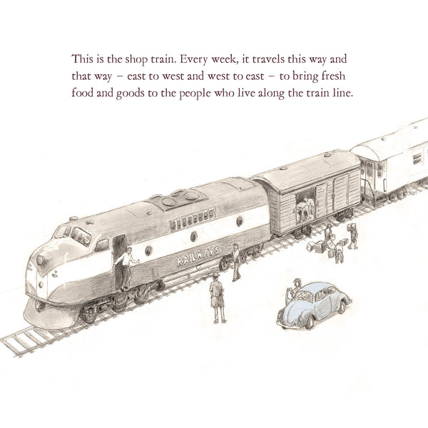 The Shop Train is a heartwarming story about Rosie and her mum, and the rickety journey in their old car to pick up stores from the shop train. The train carried everything they needed, and was an exciting time for all who lived near its tracks. Rosie and her mum slowly wind their way through Wonghi country, on its dusty tracks and never-ending horizon, until they reach the train, brimming with activity and treasures from other places.
