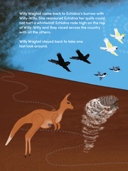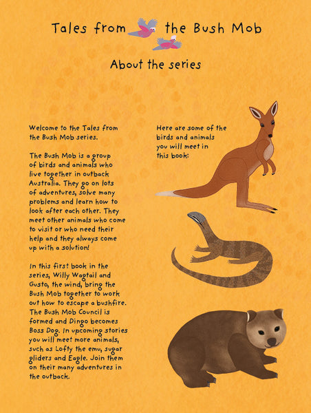 Willy-willy Wagtail is the first book in the series and goes back to before Bush Mob get together and nobody understands each other – and there are lots of fights. One day there is a terrible bush fire and Willy Wagtail, Gusto (the wind) and Crow get all the Bush Mob to work together to save the community. For the first time, everyone understands each other and Dingo takes charge and leads all the animals to safety. Dingo is now Boss Dog and is head of the Bush Council, with Willy Wagtail and Crow – the Bush Mob is formed.